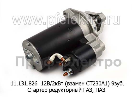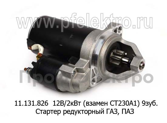 11.131.826 12В/2кВт (взамен СТ230А1) 9зуб. Стартер редукторный для газ-53, -66, -71, -73, паз-672 М, дв.ЗМЗ 511.10,513.10,73, 5234.10 (Прамо)