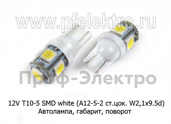 Артикул: 12V Т10-5 SMD white (А12-5-2 ст.цок. W2.1x9.5d)