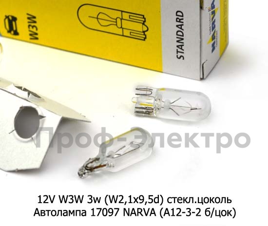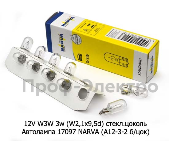 12V W3W 3w (W2.1x9.5d) стекл.цоколь Автолампа 17097 NARVA (А12-3-2 б/цок) Нарва, все т/с 12В