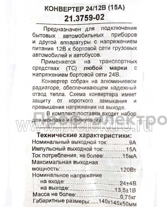 21.3759-02 ПН 24/12В-15А Преобразователь напряжения, для камаз, маз, все т/с (Энергомаш)