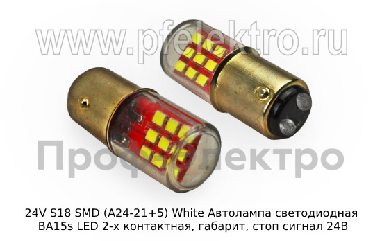 Светодиодная автолампа 24V S18 SMD (А24-21+5) White предназначена для использования в автомобилях с напряжением 24 Вольта. Лампа имеет стандартный 2-х контактный разъем BA15s и может использоваться как габаритный, стоп-сигнал или поворотник. Изготовлена в Китае из качественных материалов с применением светодиодов высокой яркости, что обеспечивает долгий срок службы и качественное освещение. Благодаря низкому энергопотреблению и высокой яркости, данная автолампа является отличным выбором для улучшения безопасности и внешнего вида вашего автомобиля.