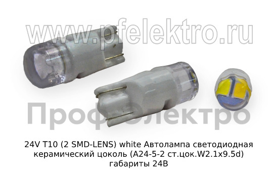 Светодиодная автолампа 24V T10 (2 SMD-LENS) white с керамическим цоколем А24-5-2 ст.цок.W2.1x9.5d - это прекрасное решение для автомобилей с 24-вольтной электрической сетью. Она обладает превосходной яркостью и освещением на большом расстоянии, что значительно повышает безопасность на дороге в темное время суток.