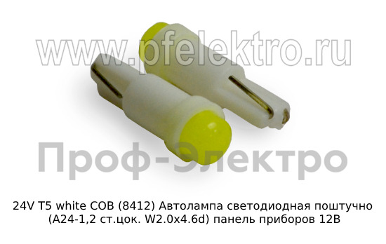 Светодиодная автолампа 24V T5 white COB (8412) предназначена для установки в автомобильные панели приборов. Она имеет стандартный цоколь W2.0x4.6d и работает от напряжения 24В. Светодиоды COB обеспечивают яркий белый свет и долгий срок службы. Эта лампа произведена в Китае и предлагается поштучно. Идеальное решение для замены обычных ламп и создания стильного и комфортного освещения в салоне автомобиля.