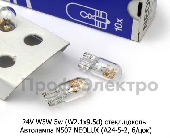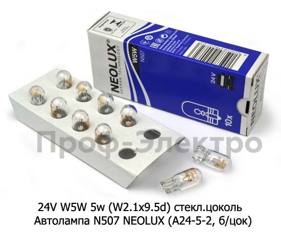 24V W5W 5w (W2.1x9.5d) стекл.цоколь Автолампа N507 NEOLUX (А24-5-2, б/цок) Неолюкс, все т/с 24В