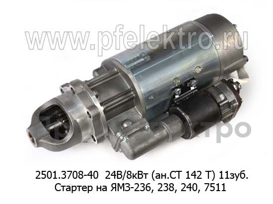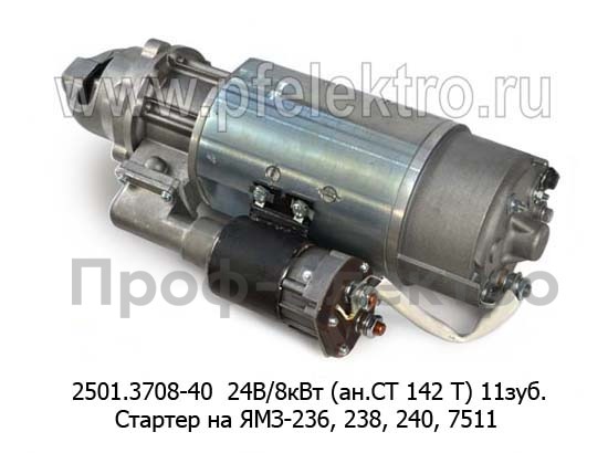 2501.3708-40 (ВТ) 24В/8кВт (ан.СТ 142 Т) 11зуб. Стартер для маз, белаз, краз, моаз, урал (ЯМЗ-236, 238, 240, 7511) (ВТ)