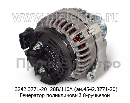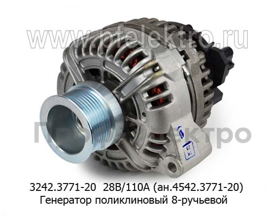 3242.3771-20 28В/110А (ан.4542.3771-20) Генератор поликлиновый 8-ручейный с 5-пиновым разъемом для камаз с дв.Евро-4, Евро-5 и модиф. (БАТЭ)