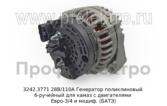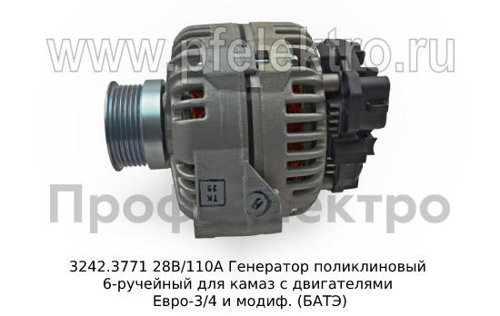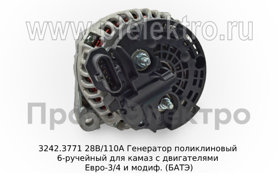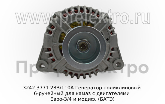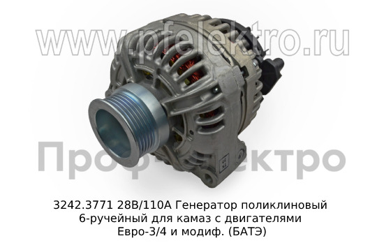 3242.3771 28В/110А Генератор поликлиновый 6-ручейный для камаз с двигателями Евро-3/4 и модиф. (БАТЭ)