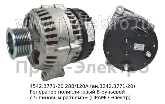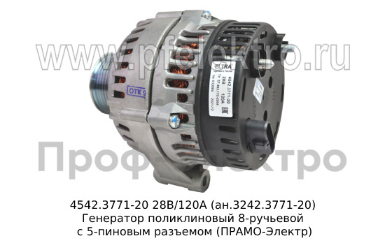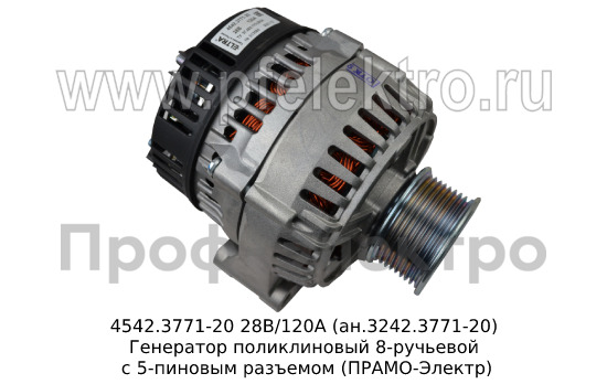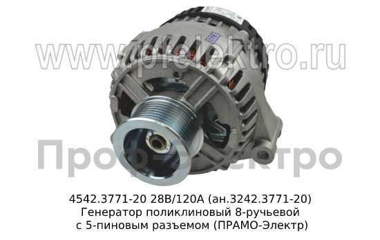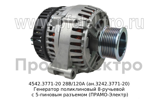 4542.3771-20 28В/120А (ан.3242.3771-20) Генератор поликлиновый 8-ручьевой с 5-пиновым разъемом для камаз с дв.Евро-4, Евро-5 и модиф. (ЭЛТРА)