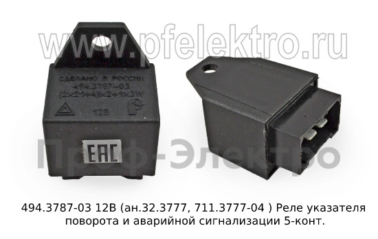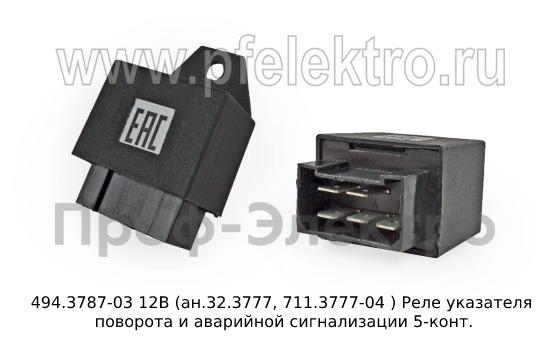 Реле указателя поворота и аварийной сигнализации 494.3787-03 12В (ан.32.3777, 711.3777-04) предназначено для использования в автомобилях Газ-3110, 33021 "Газель" и 2752 "Соболь". Это 5-контактное реле надежно управляет поворотными указателями и аварийной сигнализацией в автомобиле. Оно обеспечивает стабильную и надежную работу указателей поворота и аварийной сигнализации, что способствует безопасности на дороге. Данное реле является оригинальным запчастью и отличается высоким качеством и долговечностью. Если вам требуется замена этого элемента на вашем автомобиле, реле 494.3787-03 12В (ан.32.3777, 711.3777-04) является отличным выбором.