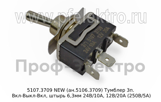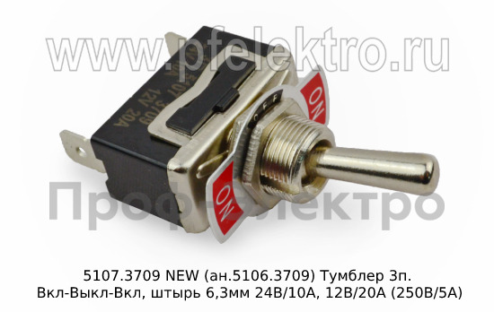 5107.3709 NEW (ан.5106.3709) Тумблер 3п. Вкл-Выкл-Вкл, штырь 6,3мм 24В/10А, 12В/20А (250В/5А) все т/с (К)