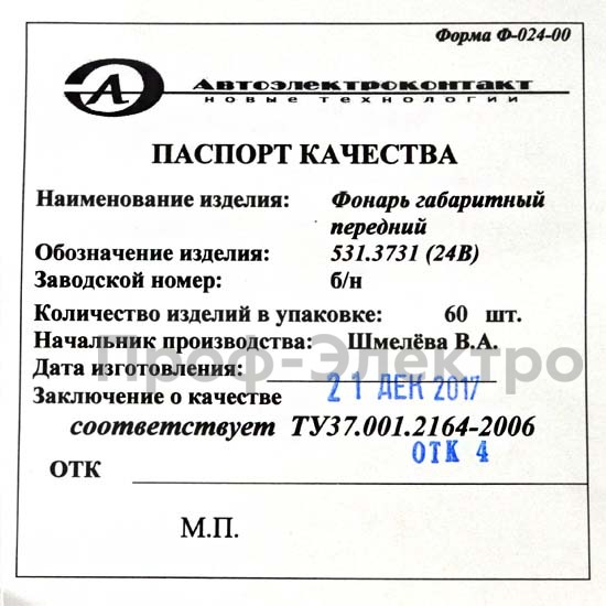 Артикул: 531.3731 LED белый (круглый) АМР разъем, 12/24В