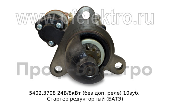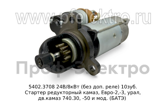 Стартер редукторный 5402.3708 24В/8кВт без дополнительного реле предназначен для использования на грузовиках Камаз, Евро-2, Евро-3, Урал с двигателями Камаз 740.30, 740.50 и других моделей. Точное количество зубьев на механизме не указано, но предполагается 10 зубьев.