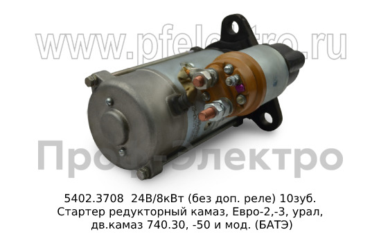 5402.3708 24В/8кВт (без доп. реле) 10зуб. Стартер редукторный камаз, Евро-2,-3, урал, дв.камаз 740.30, -50 и мод. (БАТЭ)