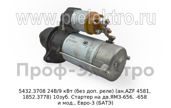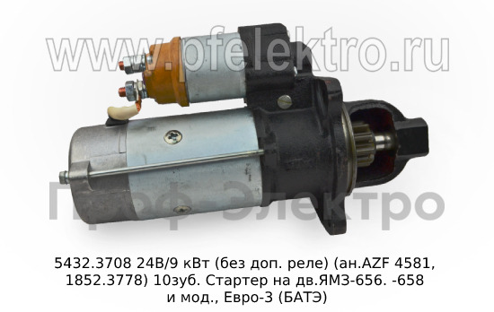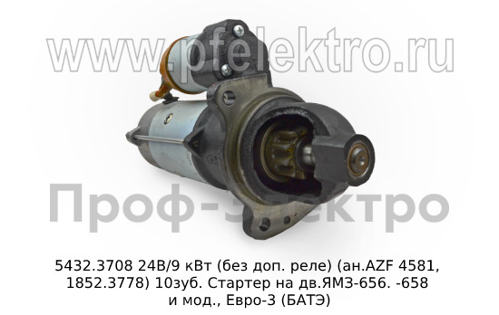 5432.3708 24В/9 кВт (без доп. реле) (ан.AZF 4581, 1852.3778) 10зуб. Стартер на дв.ЯМЗ-656. -658 и мод., Евро-3 (БАТЭ)