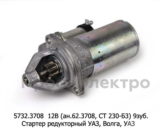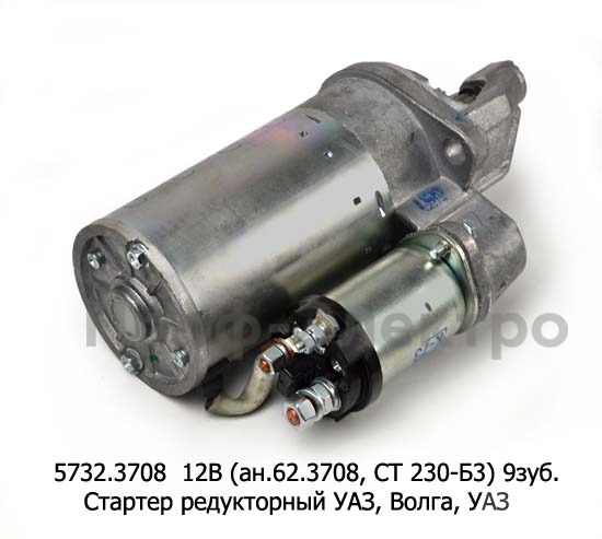 5732.3708 12В/1,7кВт (ан.62.3708, СТ 230-Б3) 9зуб. Стартер редукторный для уаз-469, -2206, -31514, Волга дв.402, уаз-3960 (ЗИТ)