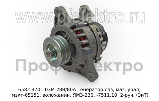 6582.3701-03М 28В/80А Генератор лаз, маз, урал, мзкт-65151, воложанин, ЯМЗ-236, -7511.10, 2-руч. (ЗиТ)