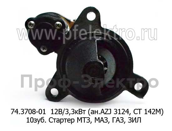 74.3708-02 12В/3,6кВт (ан.AZJ 3124, СТ 142М) 10зуб. Стартер для мтз, маз, газ, Д-243, Д-245, Д-246, зил-Бычок (БАТЭ)