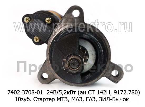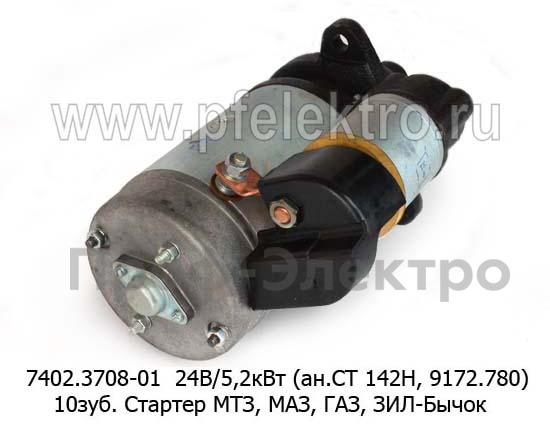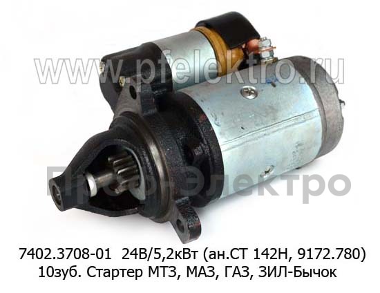 7402.3708-01 24В/5,2кВт (ан.СТ 142Н, 9172.780) 10зуб. Стартер для мтз, маз, газ, Д-243, Д-245, Д-246, зил-Бычок (БАТЭ)