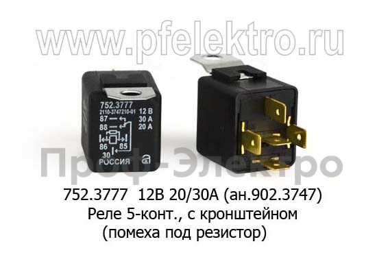 752.3777 12В 20/30А (ан.902.3747) Реле 5-конт., с кронштейном (помеха под резистор) для ваз, газ, Волга, все т/с (АВАР)