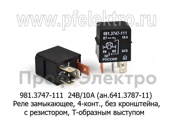 981.3747-111 24В/10А (ан.641.3787-11) Реле замыкающее, 4-х контактное, без кронштейна, с резистором, Т-образным выступом для камаз, маз (АВАР)