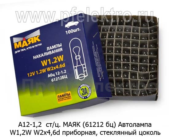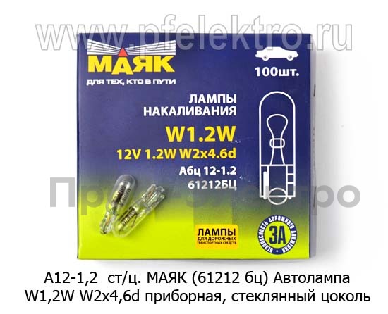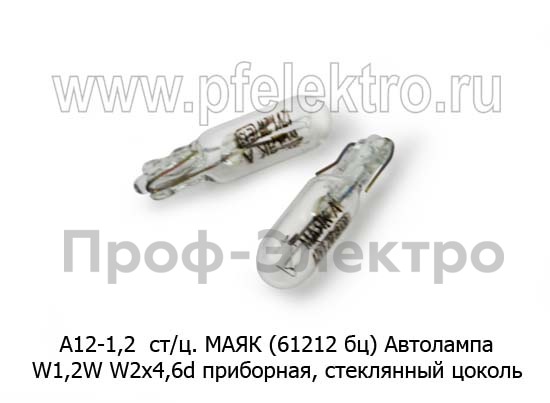 А12-1,2 ст/ц. W2x4,6d МАЯК (61212 бц) Автолампа W1,2W W2x4,6d приборная, стеклянный цоколь, все т/с 12В (МАЯК)