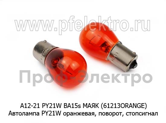А12-21 Оранжевая BA15s МАЯК (61213ORANGE) Автолампа PY21W BA15s, поворот, стопсигнал, все т/с 12В (МАЯК)