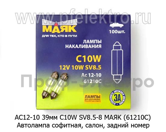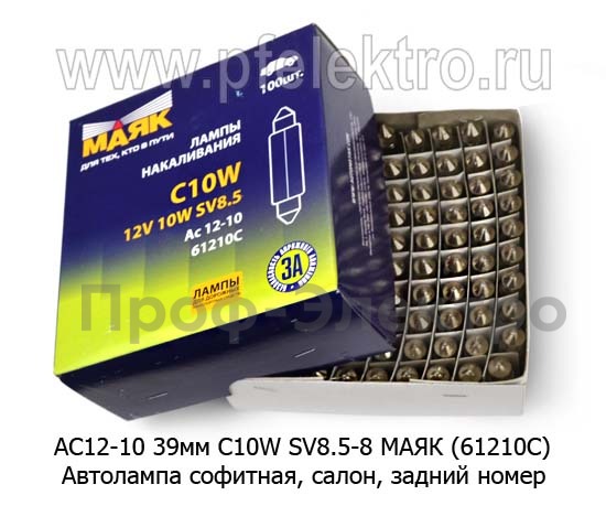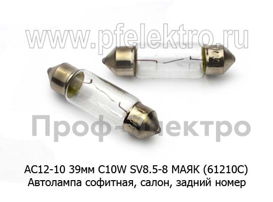 АС12-10 39мм SV8.5-8 МАЯК (61210С) Автолампа софитная C10W SV8.5-8, салон, задний номер, все т/с 12В (МАЯК)