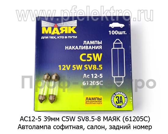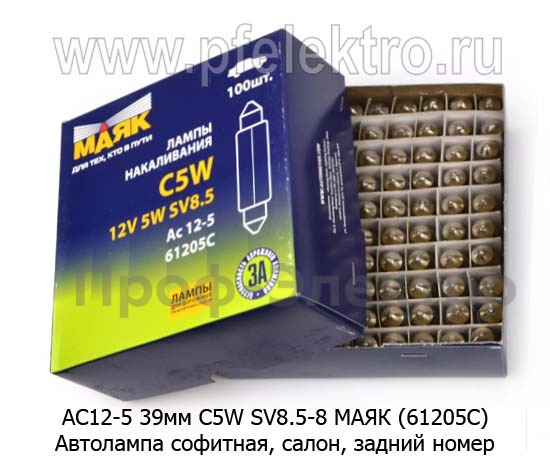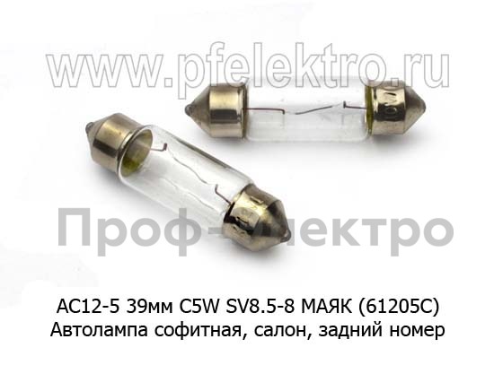 АС12-5 39мм SV8.5-8 МАЯК (61205C) Автолампа софитная C5W SV8,5-8, салон, задний номер, все т/с 12В (МАЯК)