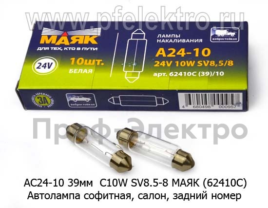 АС24-10 39мм SV8.5-8 МАЯК (62410С) Автолампа софитная C10W SV8.5-8, салон, задний номер, все т/с 24В (МАЯК)