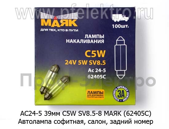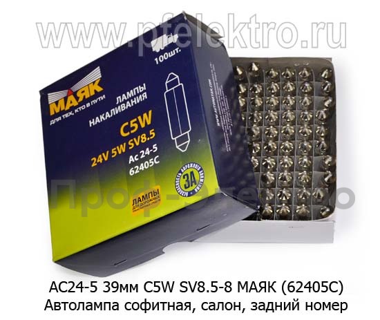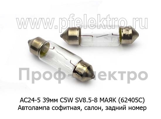АС24-5 39мм SV8.5-8 МАЯК (62405C) Автолампа софитная C5W SV8,5-8, салон, задний номер, все т/с 24В (МАЯК)