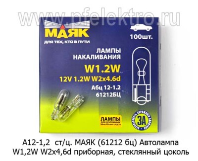 Автолампа W1,2W W2x4,6d приборная, стеклянный цоколь, все т/с 12В (МАЯК)
