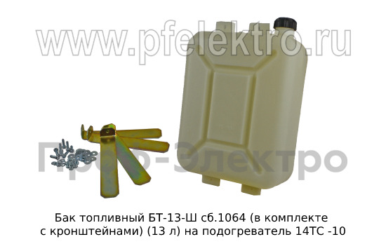 Бак топливный БТ-13-Ш сб.1064 (в комплекте с кронштейнами) предназначен для использования на грузовых транспортных средствах. Емкость бака составляет 13 литров и он подходит для установки на подогреватель 14ТС -10 Теплостар.