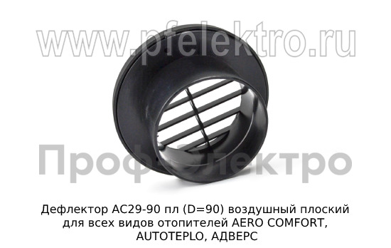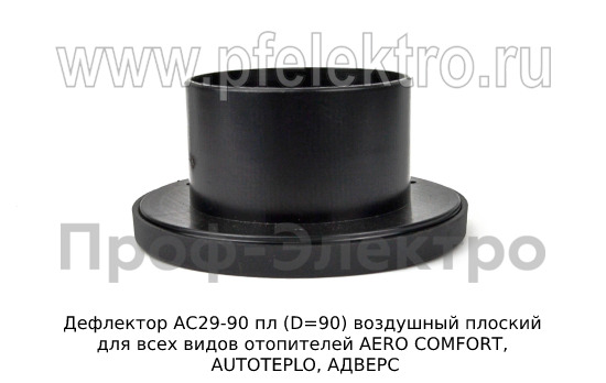 Дефлектор АС29-90 пл (D=90) - воздушный плоский дефлектор, предназначенный для всех видов отопителей, таких как AERO COMFORT, AUTOTEPLO, АДВЕРС. Он помогает равномерно распределять теплый воздух в помещении, что делает его более комфортным и эффективным. Продукт производится компанией ТеплоАвто, что гарантирует его высокое качество и надежность. Установка дефлектора позволит улучшить работу вашего отопительного оборудования и создать более уютную атмосферу в помещении.