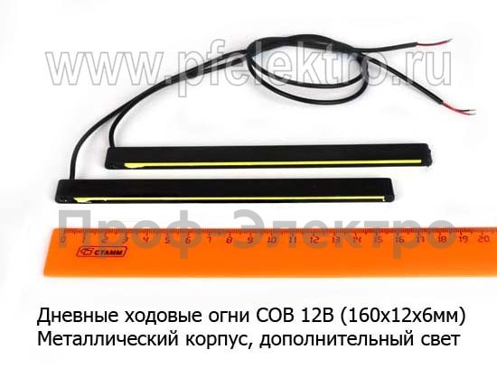 Дневные ходовые огни COB 12В ДХО металлический корпус, плоские, с проводами (160х12х6мм) дополнительный свет, все т/с (К)