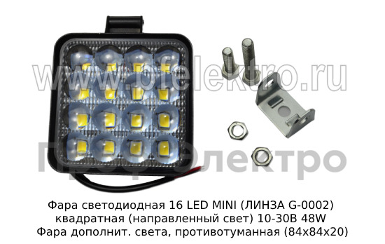 Артикул: Фара светодиодная 16 LED MINI ЛИНЗА (G-0002) квадратная (направленный свет) 10-30В 48W