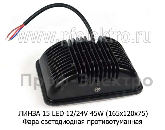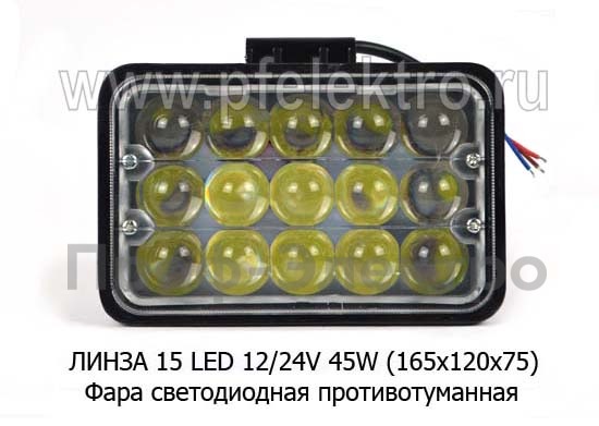 Фара светодиодная ЛИНЗА 15 LED (0886) прямоугольная 12/24V 45W Фара противотуманная ДХО ближнего и доп. света (165х120х75) все т/с (К)