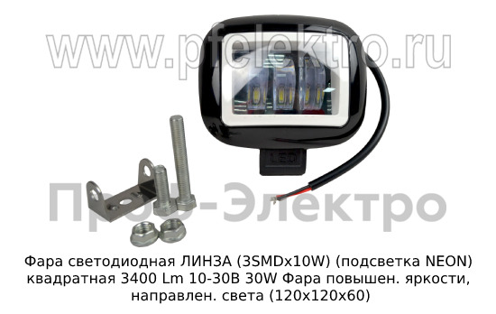 Артикул: Фара светодиодная ЛИНЗА G0241 (3SMDх10W) (подсветка NEON) квадратная 3400 Lm 9-32В 35W