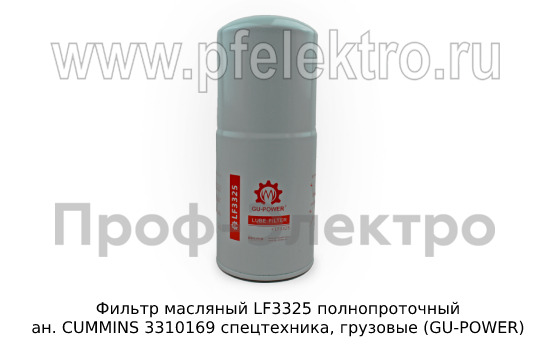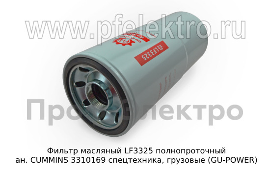 Фильтр масляный LF3325 полнопроточный Маслянный фильтр ан. CUMMINS 3310169 спецтехника, грузовые (GU-POWER)