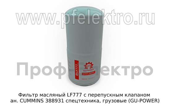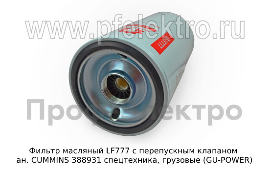 Фильтр масляный LF777 с перепускным клапаном Маслянный фильтр ан. CUMMINS 388931 спецтехника, грузовые (GU-POWER)