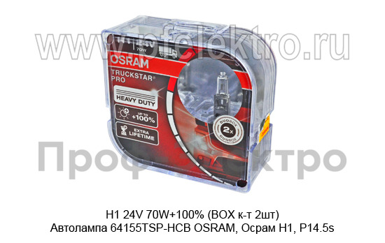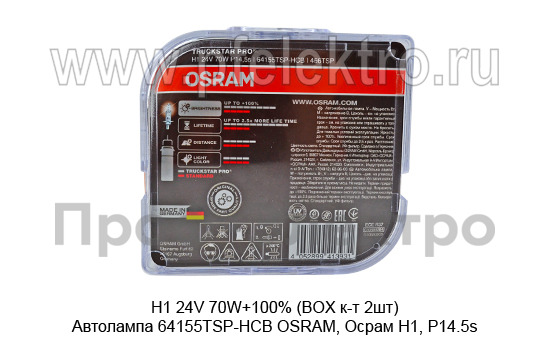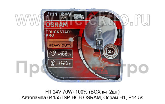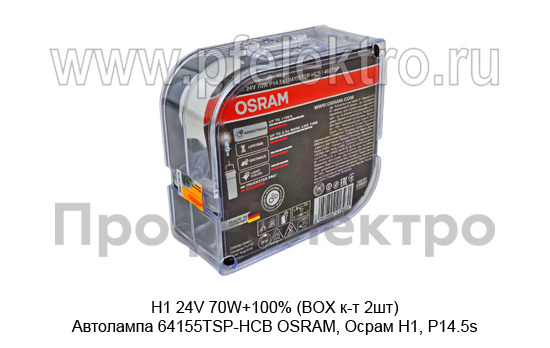 H1 24V 70W+100% (BOX к-т 2шт) Автолампа 64155TSP-HCB OSRAM, Осрам Н1, P14.5s все т/с 24В