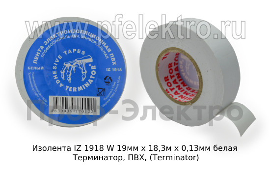 Изолента IZ 1918 W 19мм х 18,3м х 0,13мм белая Изолента Терминатор, ПВХ, все т/с (Terminator)
