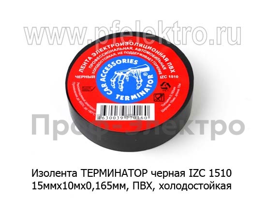 Изолента IZC 1510 15мм х 10м х 0,165 мм черная Изолента Терминатор, ПВХ, холодостойкая, все т/с (Terminator)