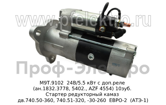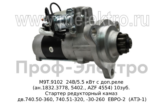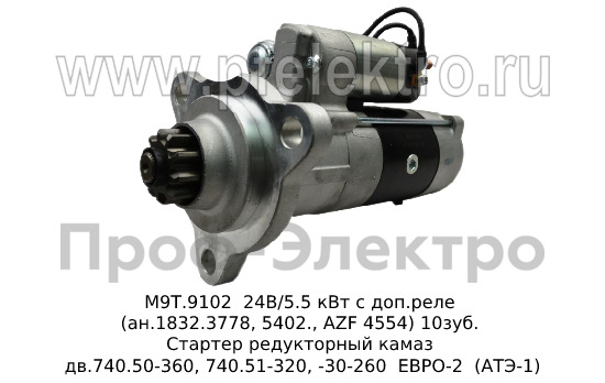 М9Т.9102 24В/5.5 кВт с доп.реле (ан.1832.3778, 5402., AZF 4554) 10зуб. Стартер редукторный камаз дв.740.50-360, 740.51-320, -30-260 ЕВРО-2 (АТЭ-1)