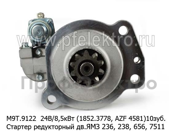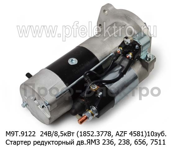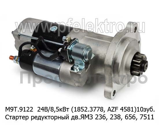 М9Т.9122 24В/8,5 кВт с доп.реле (ан. 5432.-01, AZF 4581) 10зуб. Стартер редукторный на урал, маз, камаз с дв.ЯМЗ 236, 238, 656, 7511 (АТЭ-1)