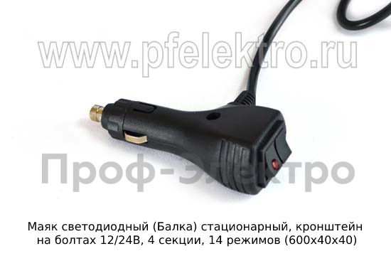 Размеры маяка составляют 600х40х40 мм. Питание можно подключить как от 12В, так и от 24В. Изделие произведено в Китае, что гарантирует надежность и качество материалов.