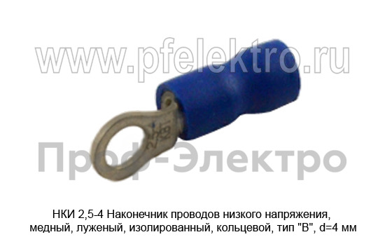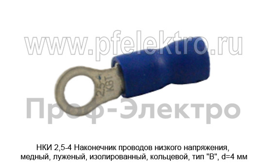 НКИ 2,5-4 Наконечник проводов низкого напряжения, медный, луженый, изолированный, кольцевой, тип "В", d=4 мм все т/с (КВТ)