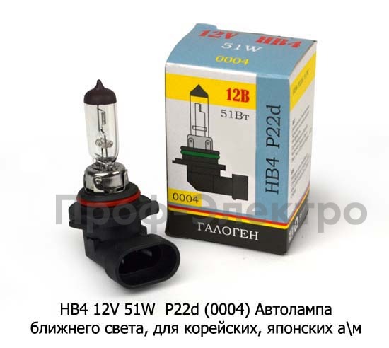 НВ4 12V 51W P22d (0004) Автолампа НВ4 ближнего света, для корейских, японских а\м, все т/с 12В (К)