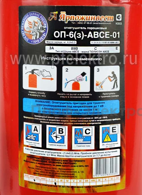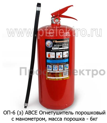 - Класс E. Огнетушитель ОП-6 (з) АВСЕ также эффективен при тушении пожаров, возникающих вблизи электрических установок до 1000 вольт. Он обладает специальной конструкцией, которая предотвращает возможные поражения электрическим током при контакте с электрооборудованием.