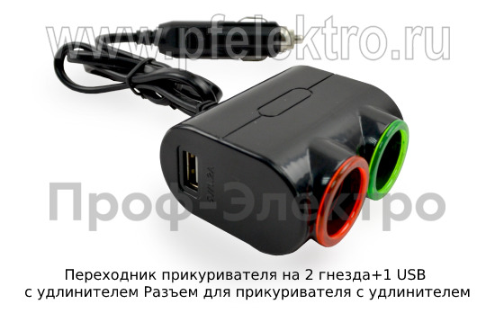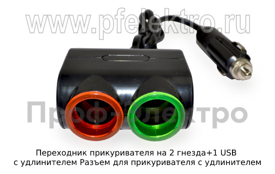 Артикул: Переходник прикуривателя на 2 гнезда+1 USB c удлинителем