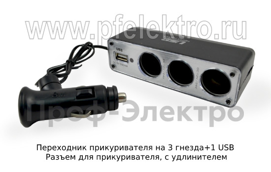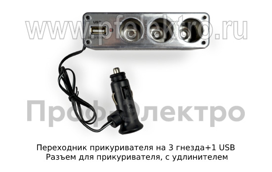 Артикул: Переходник прикуривателя на 3 гнезда+1 USB
